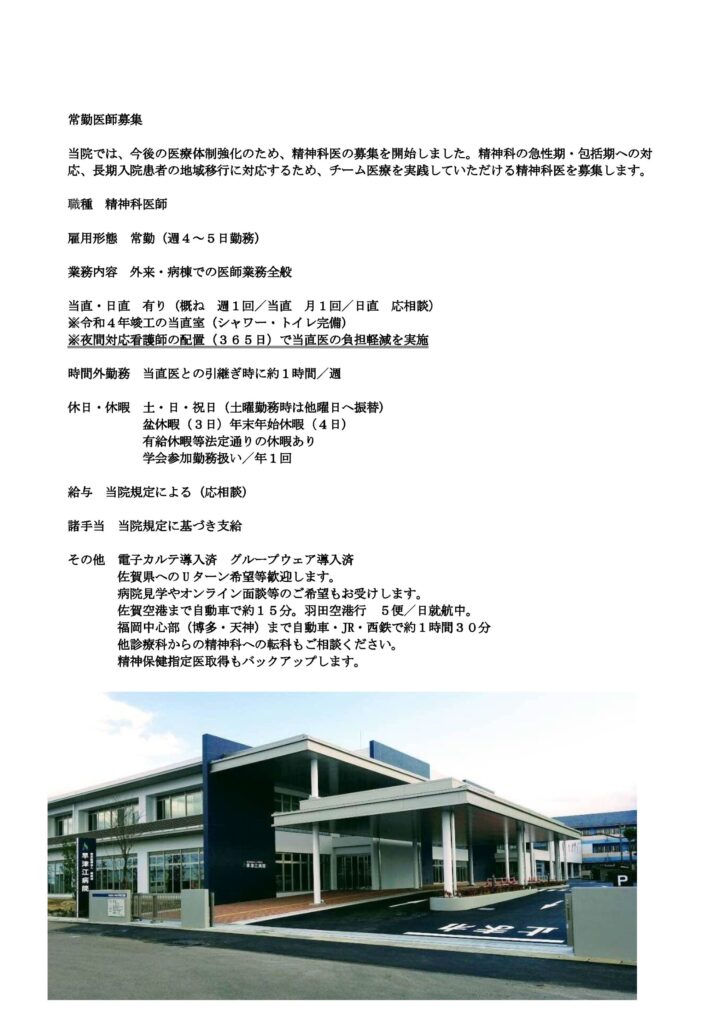 【NEW】医療体制強化のため、精神科医師を募集します。